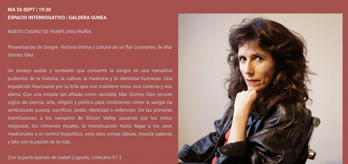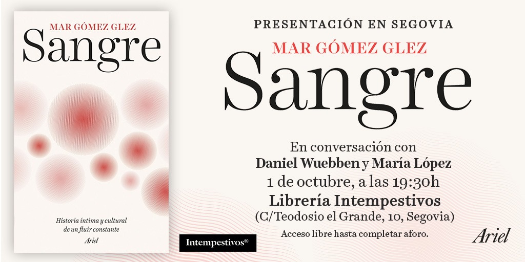 Dejo aquí algunos enlaces con entrevistas sobre el libro «Sangre. Historia íntima y cultural de un fluir constante» Sapiens: https://www.rtve.es/play/audios/sapiens/ Las mañanas de RNE: Sexta hora – 15/09/25: https://www.rtve.es/play/audios/las-mananas-de-rne/ Onda cero, Por fin: https://www.ondacero.es/programas/por-fin/audios/entrevistas/mar-gomez-que-motivo-escribir-libro-que-habia-libro-que-hablara-parte-medica-parte-simbolica-sangre_2025091068c1b113bf88027389796106.html